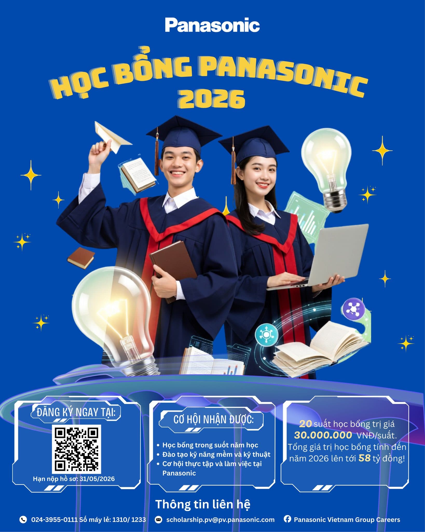 + Hoặc nộp hồ sơ trực tuyến qua link: https://bit.ly/ DonDangkyHocbongPanasonic2026 (nén các tệp theo yêu cầu khi tải lên) đến hết ngày 31/5/2026 (Chủ Nhật).